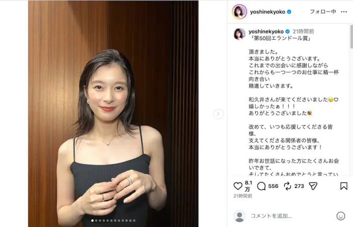 俳優の芳根京子が自身のInstagramを更新し、「2026年 第50回エランドール賞」を受賞したことを報告した。 投稿され…