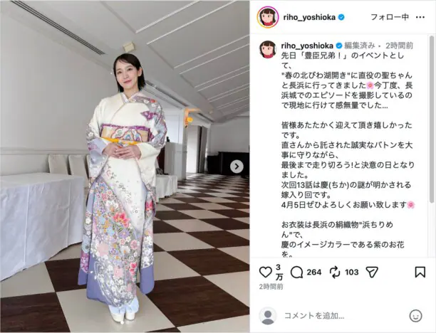 俳優の吉岡里帆が自身のInstagramを更新し、NHK大河ドラマ『豊臣兄弟!』のイベント「春の北びわ湖開き」に出席した際の写真…