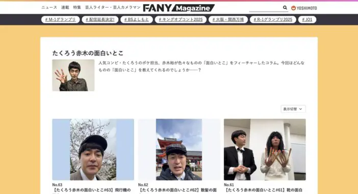 文芸 2025.12.25 06:55 M-1優勝芸人・たくろう、文筆家としての魅力は? 「たくろう赤木の面白いとこ」の面白いとこ 今年もM-1が面白かった。とくに優勝したたくろうの漫才は爆笑だった。このコラムでは、そんなM-1優勝芸人たくろうのボケ・赤木がど… 住本賢一 吉本興業住本賢一たくろう赤木裕FANY Magazine