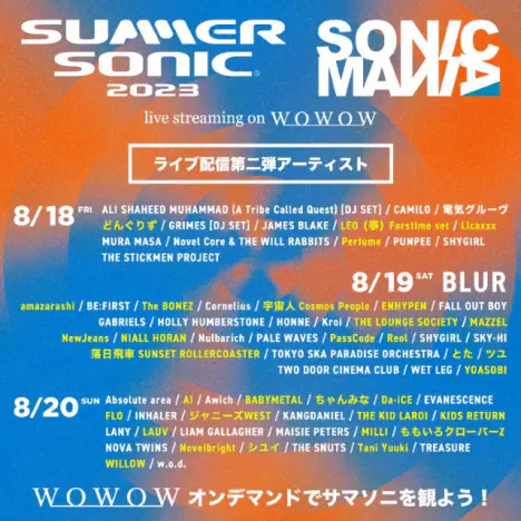 WOWOWオンデマンドにて独占ライブ配信される『SUMMER SONIC 2023』と『SONICMANIA』の、配信アーティス…