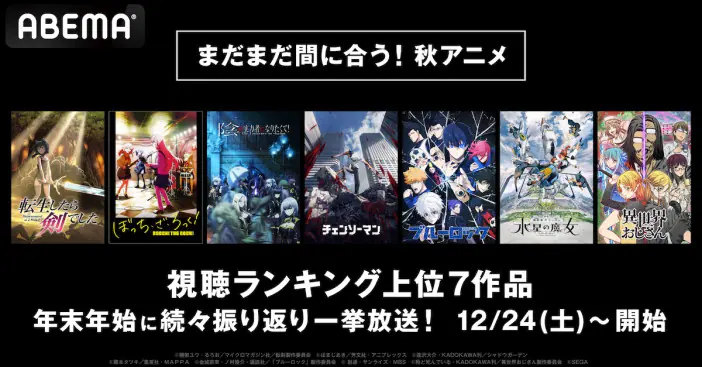 ABEMAにて2022年12月24日から年末年始にかけて、人気ランキング上位の2022年秋アニメ全7作品が一挙放送される。 …