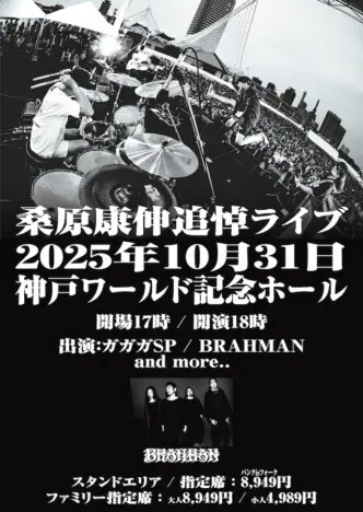 今年2月に急逝したガガガSPのベーシスト・桑原康伸を偲ぶべく、全国のファンが神戸・ワールド記念ホールに集結した『桑原康伸追悼ライ…