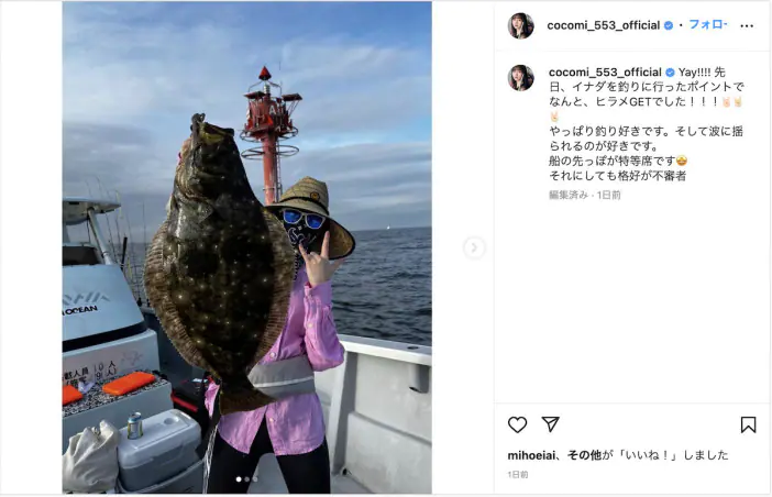 Cocomiが68cmの巨大なヒラメを釣り上げたことを自身のInstagramにて報告している。 Cocomiは「Yay!!…