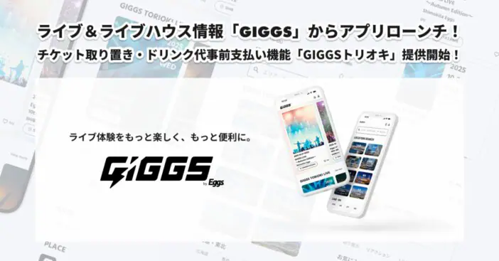 ニュース 2025.10.30 18:07 「GIGGS(ギグス)」のスマートフォン向け公式アプリ配信開始 チケットとドリンクを事前支払いできる機能を実装 エッグスは、全国のライブハウスを中心にライブ情報を集めたプラットフォーム「GIGGS(ギグス)」のスマートフォン向け公式ア… リアルサウンドテック編集部 ライブハウスEggsGIGGS