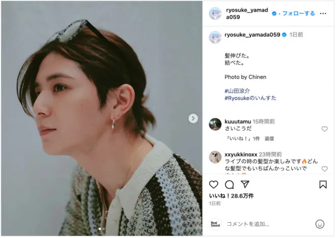 Hey! Say! JUMPの山田涼介が11日、自身のInstagramを更新。伸びた髪を結んだヘアスタイルを公開。メンバーの知…