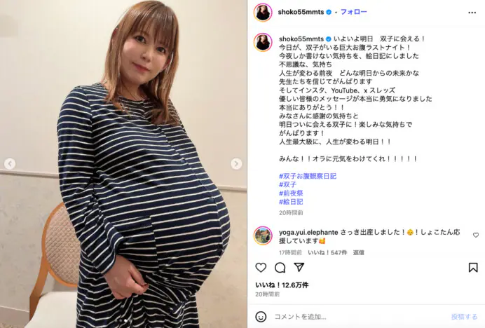 中川翔子、出産前日の“巨大お腹”ショット 生まれた双子に「人生かけて守っていきたい」