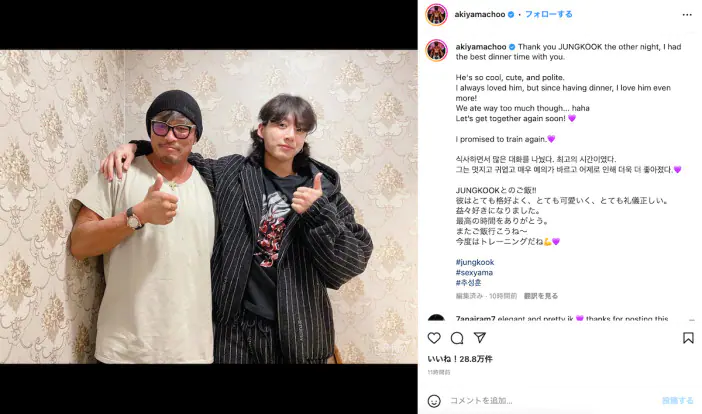 総合格闘家の秋山成勲が、BTSのJUNG KOOKとのツーショットを自身のInstagramに公開した。 昨年6月にJUNG…