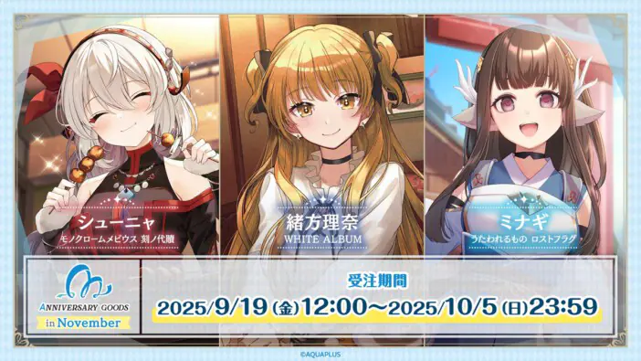 「アクアプラス」キャラのアニバーサリーグッズ企画第5弾にシューニャ、緒方理奈、ミナギがラインナップ