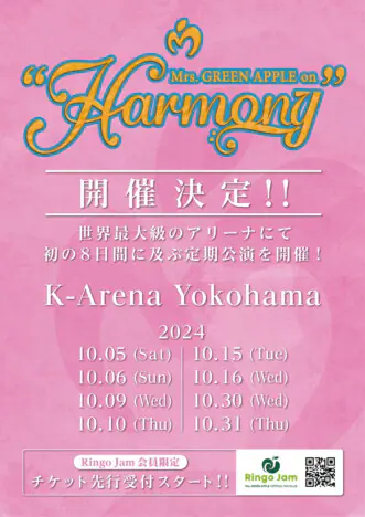 Mrs. GREEN APPLEが、10月にKアリーナ横浜にて、同アリーナでは史上初となる8日間に及ぶ定期公演『Mrs. GRE…