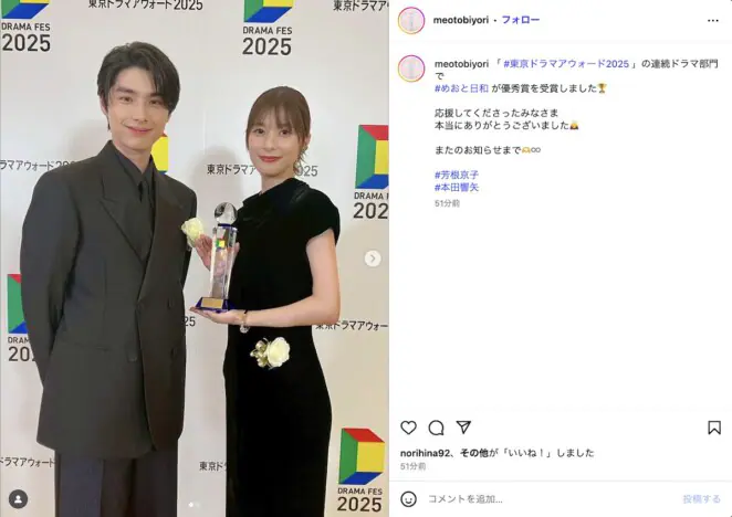 『波うららかに、めおと日和』(フジテレビ系)の公式Instagramが『東京ドラマアウォード2025』の「連続ドラマ部門」で優秀…