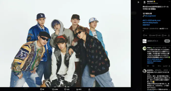 コラム 2025.04.05 05:50 BE:FIRST、『Nコン』課題曲に乗せられた大切なメッセージ 7人が歌うからこそ増していく説得力 毎年10万人が参加する日本最大規模の合唱コンクール『NHK全国音楽コンクール』が今年も開催される。その中学校の部の課題曲「空」を… 高橋梓 高橋梓男性グループBMSGBE:FIRSTNHK全国音楽コンクール