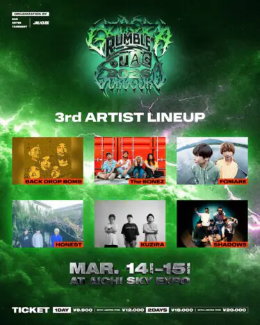 2026年3月14日、15日にAichi Sky Expoにて開催されるパンク/ラウドフェス『RUMBLE×JAG 2026』の…
