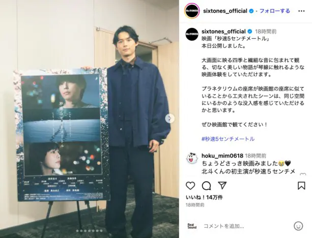 松村北斗(SixTONES)が主演を務める実写映画『秒速5センチメートル』が、10月10日に公開された。SixTONESの公式I…