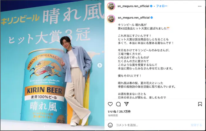 Snow Manの目黒蓮が2月6日、自身のInstagramを更新。自身がCM出演するキリンビール「晴れ風」が第43回食品ヒット…