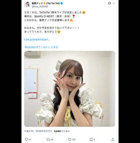 Toi Toi Toiの星野ティナが、活動再開を発表した。 本情報は、本日3月21日に行われた主催ライブ『〜Choose L…