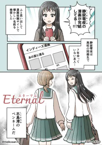 Web漫画 2024.05.05 07:00 【漫画】漫画の創作で意気投合した女子高生ふたり、7年ぶりの“再会”はーーSNS漫画『Eternal』が尊い 「ふと思い出して漫画投稿サイトで懐かしい名前を検索した 静寂零夜(しじまれいや)は高校の同級生で/7年会っていない友人… … あんどうまこと 漫画試し読みWeb漫画あんどうまことTwitter漫画