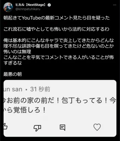 2022年10月7日、ヒカルの公式Twitterアカウントにて、誹謗中傷コメントに対する法的措置を検討していると投稿があった。 …