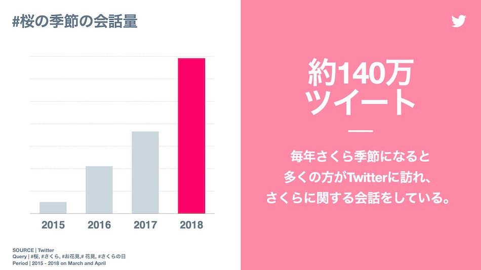 同社は、毎年桜の季節になると、Twitter上では桜に関する会話が活発になり、写真や桜にちなんだコスプレ、桜にまつわる料理や俳句など、多種多様の利用者の楽しみ方があること、2018年は約140万もの桜に関するツイートが集まったことを明かした。今年の施策は下記の通り。