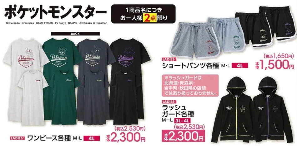 アベイルより、6月29日に「ポケットモンスター」シリーズのグッズが発売された。ホゲータ、ニャオハ、ミミッキュ、ゲンガーのイラストがプリントされたアパレルが登場。「レディース ワンーピース各種」(M・L、4Lサイズ/税込2,530円)、「レディース ショートパンツ各種」(M・L、4Lサイズ/税込1,650円)、「レディース ラッシュガード各種」(M-L、3L-4Lサイズ/税込2,530円)となっている。