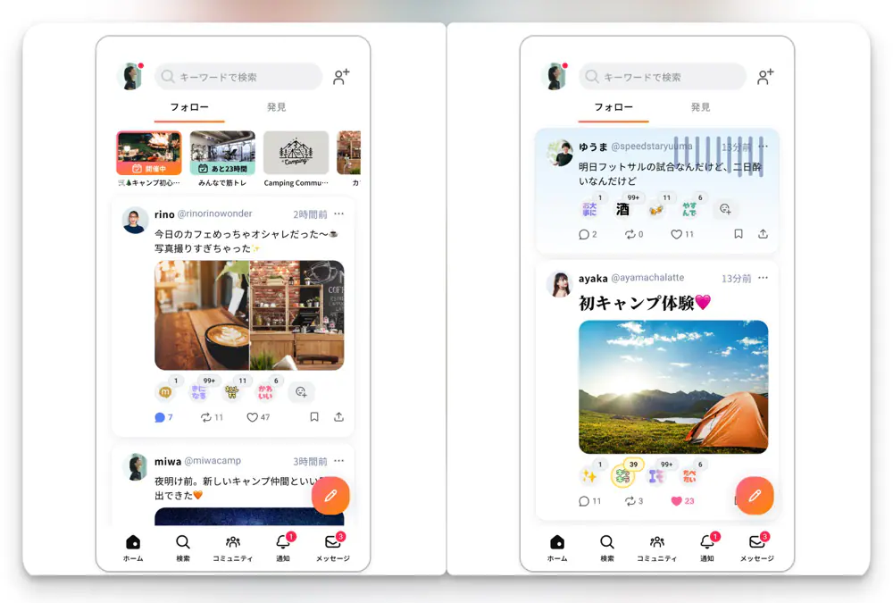 サービスの分類としては、XやThreadsなどと同様のテキストSNSで、「エモーションテキスト(エモテキ)」でテキストにエフェクトをかけたり、閲覧者側は投稿へスタンプを貼り付ける「リアクション」機能で反応することができるのが特徴だ。