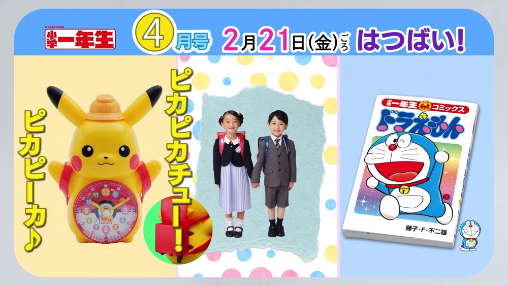 小学館が発行する雑誌『小学一年生』の4月号が、2月21日に発売する。創刊100周年の特大号として登場する本号では、付録として「おしゃべりピカチュウめざましどけい」「ドラえもんコミックス」が付いてくる。