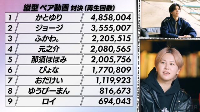まずは、“縦型ペア動画対決”から。ここでは上位から順に、かとゆりが485万、ジョージが355万、ふかわ。が220万回再生を記録。かとゆり、ぶっちぎりのトップである。一方、下位ではゆうぴーまんが81万、ロイが69万回再生と、本人たちのスキルとやる気が明瞭に結果へと反映された。かとゆりとロイの差でいえば、400万回再生も。ここでは、かとゆりに100万ポイント、そこから1位下がるごとに10万を減らしたポイントが与えられた。