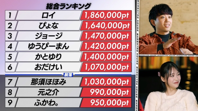 最後に、ボーナスポイント。順に、100万回再生の該当本数は3本のみ。だが、10万回再生となると、79本もがポイント対象となるという。各メンバーにポイントが加算されていき、その模様が投影されたスクリーンを、全員が緊張感しかない面持ちで見守るなか、脱落者争いは最後、おだけいと那須のふたりまで絞られ……結果は、次の通りとなった。
