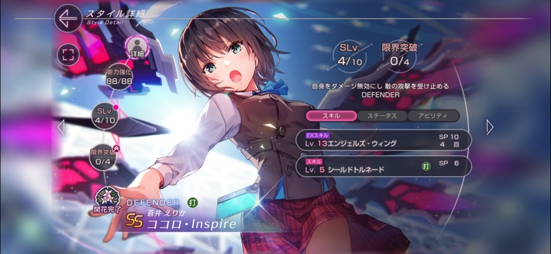 サービス開始当初はバトルの難易度が高く、未知の生命体キャンサーとの戦いに作中の茅森月歌たちセラフ部隊以上にヒリヒリする感覚を味わっていた(そして一章を終えて挫折していた)のですが、幸いにして約2年半の歳月のなかでさまざまな新スタイルが実装され、攻略の難易度は緩和。特にミッション報酬で選択取得したSSスタイル蒼井えりか(ココロ・Inspire)の無敵&ヘイト集中が優秀すぎて、一気にストーリーを進めていきました。
