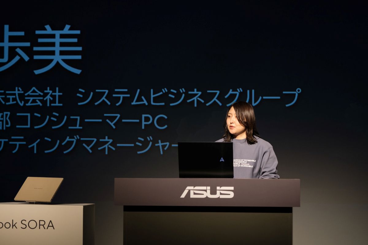 「Zenbook SORAのターゲットは学生や社会人など、外でもノートPCを使いたい幅広い世代の方々です。充電器や教科書、資料など、持ち歩くものが増えていくなかで、Zenbook SORAは参考書1冊分ほどの薄さで場所も取りません。外装も頑丈なのでスリーブなしでも使えますし、ロングバッテリーなので充電器がなくとも一日利用できます。ぜひ外に持ち出して自由に使っていただければ幸いです」