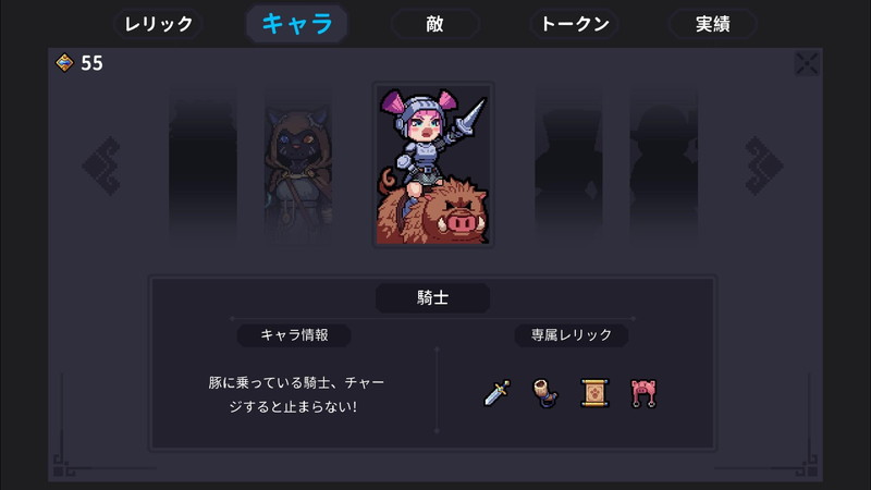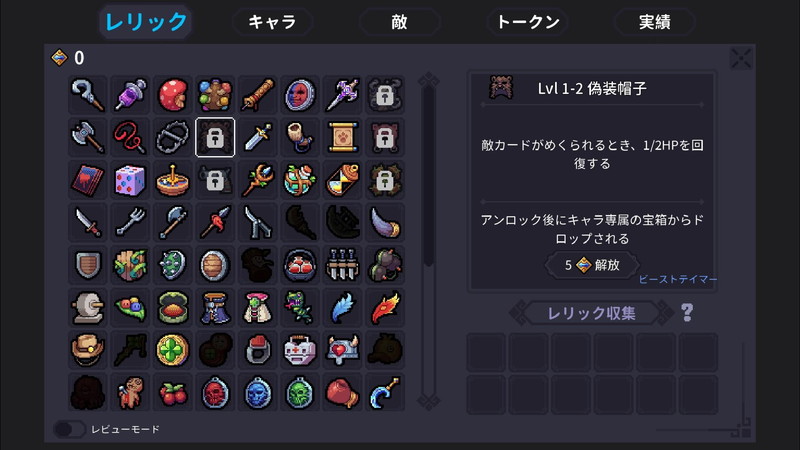 また、キャラクターや固有レリックなどをアンロックするための導線がわかりづらいのも気になった(ランの前に拠点で「図鑑」の項目を開き、ひとつずつアンロックする必要がある)。この手のジャンルではクリアごとに自動的に新要素が解禁されていくのが常なので、ジャンル経験者こそ陥りやすい罠かもしれない。