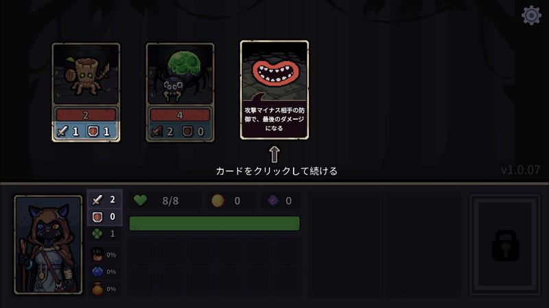 基本的な戦闘はクリックだけで完結する。「自分の攻撃力-敵の防御力」分の値だけ敵のHPを減らしていき、敵が生き残った場合だけ反撃を受ける仕組みだ。敵の特殊能力やレリックの効果を除けば、敵の反撃以外でゲームオーバーになることはない。