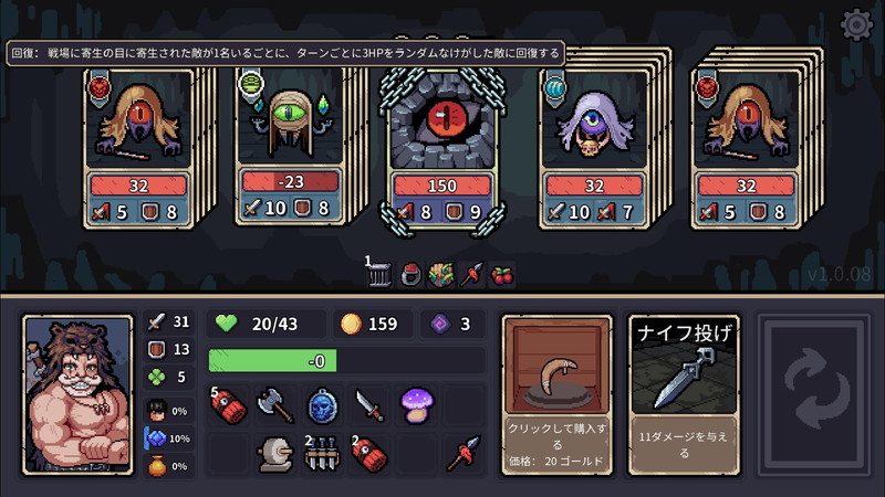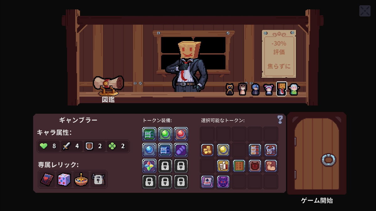 敵を倒すと、主人公の「運」の数値に応じてお金を獲得でき、道中でアイテムやレリックを収集しながらダンジョンの奥地を目指していく。非常に一般的なデッキ構築ローグライトだが、ここからがミソである。