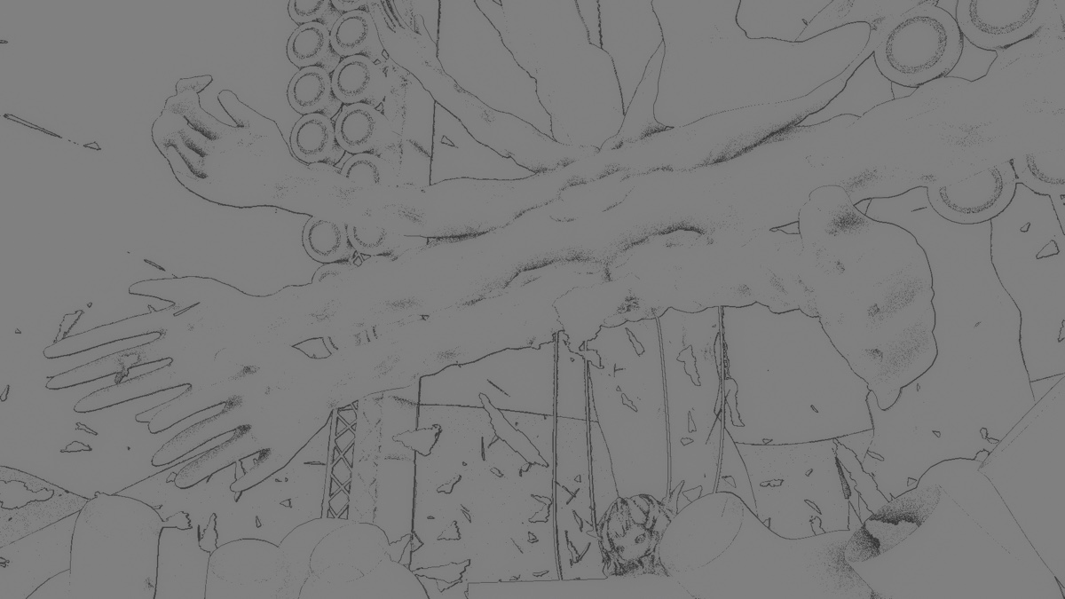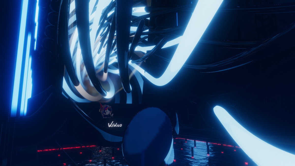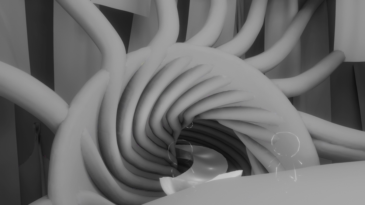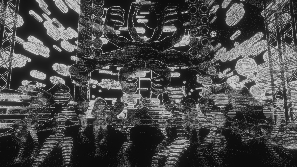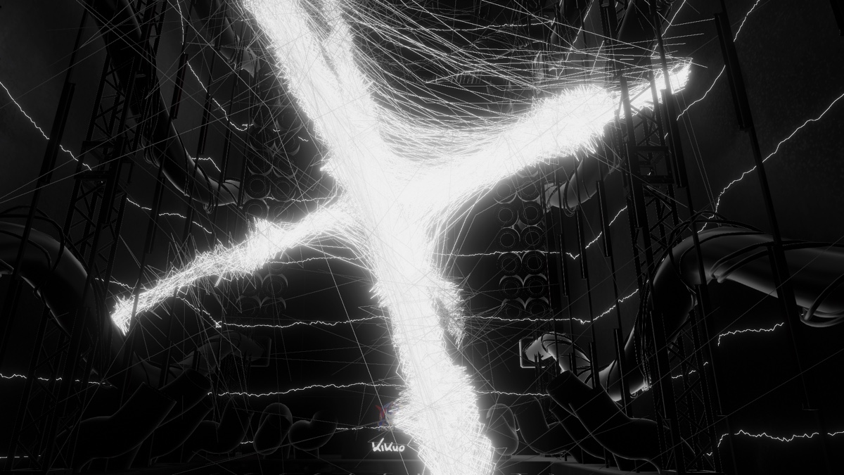 手法としてはプレイヤーの「動きのデータ」を読み取って、それを輪になったパターンで展開するというやり方で演出しています。なので、身長や体、手の動きも再現できています。途中で輪切りにされた体が飛んでいくシーンは、意識と体が切り離されていくイメージでねむり木さんにお願いして出てきたものですね。