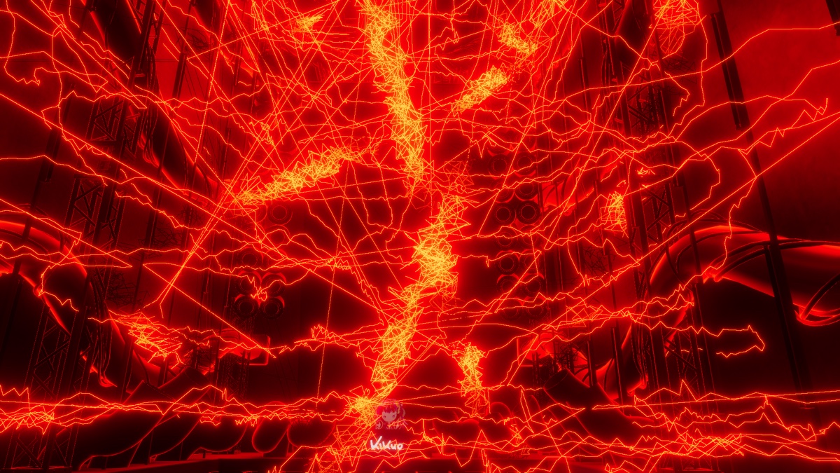 三日坊主:見ている人の気持ちが高まってぐちゃぐちゃになってしまう場面にしたかったんですよ。「てんしょう しょうてんしょう」のところは、よるとうげチームの天才シェーダーアーティスト・Renardさんにお願いしました。最初に糸の演出システムをRenardさんに作ってもらい、最終的には僕がそれを使ってVJ感覚で色々と組み合わせていきました。