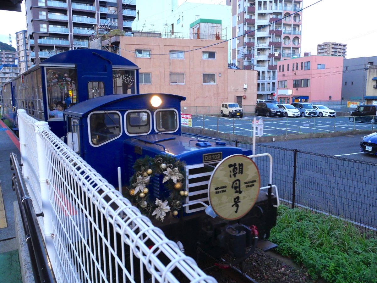 ふたたび福岡県に舞い戻ってきました。ここから『門司港(もじこう)』へ向かいます。完全ノープランで、さてどうやって行こうかと思っていたところ、『潮風号』というレトロ観光列車にたまたま遭遇。少し待てば発車するようなので、さっそく乗車します。列車のフォルムが可愛すぎる!