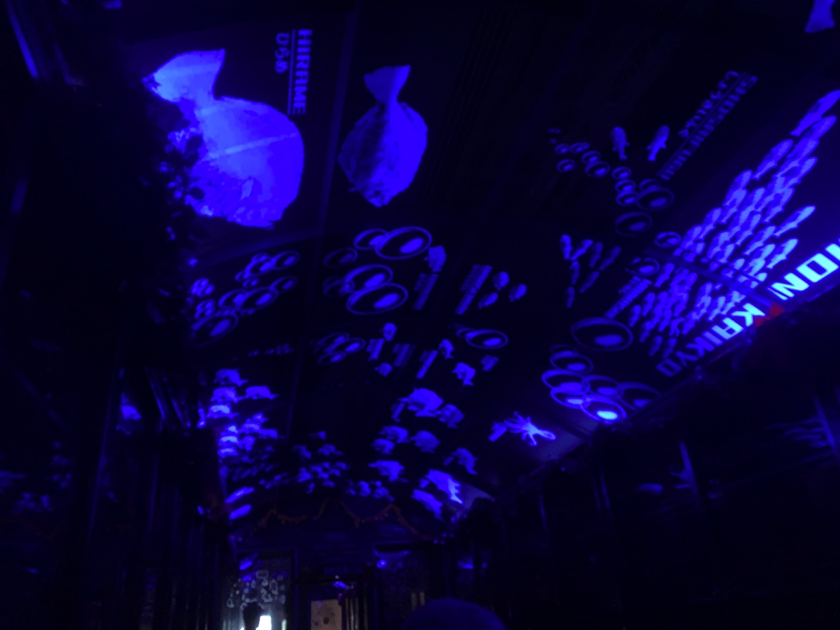 内装もとても素敵だったのですが、トンネルに入ると、天井には光り輝くお魚たちが写ります。窓からは海が見え、列車はゆっくりと進んでいきます。本当に素敵な出会いでした。もっと乗っていたかった……。