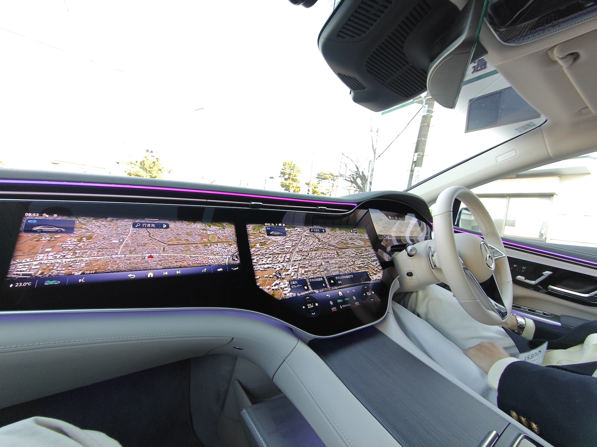 以上が予備知識で実際に乗ってみると、そこはさすがメルセデスと膝を叩きたくなるクルマだった。空気抵抗を考慮された格納式のドアノブを引いて運転席へ。そこは助手席までスクリーンが広がる「MBUXハイパースクリーン」が目の前に。車内の幅目一杯使ったような141cmのディスプレイパネルは圧巻。なおMCでこのスクリーンは全モデルに標準装備化された。余談だがこのディスプレイは画面の「焼き付き」を抑えるため見てもわからないように反時計回りに回転させている。