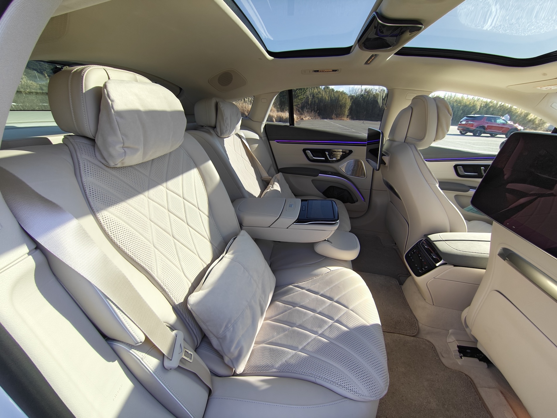 試乗車は新設定の「エクスクルーシブパッケージ」がオプション装着されていて最大38度までのリクライニングなど至れり尽くせりの室内空間に。加えてMBUXリアエンターテイメントは右後席は動画、左後席は音楽と個々で楽しむことができるほか自分のスマホと接続し、メルセデス純正のヘッドホンでオンライン会議といった使い方も可能。