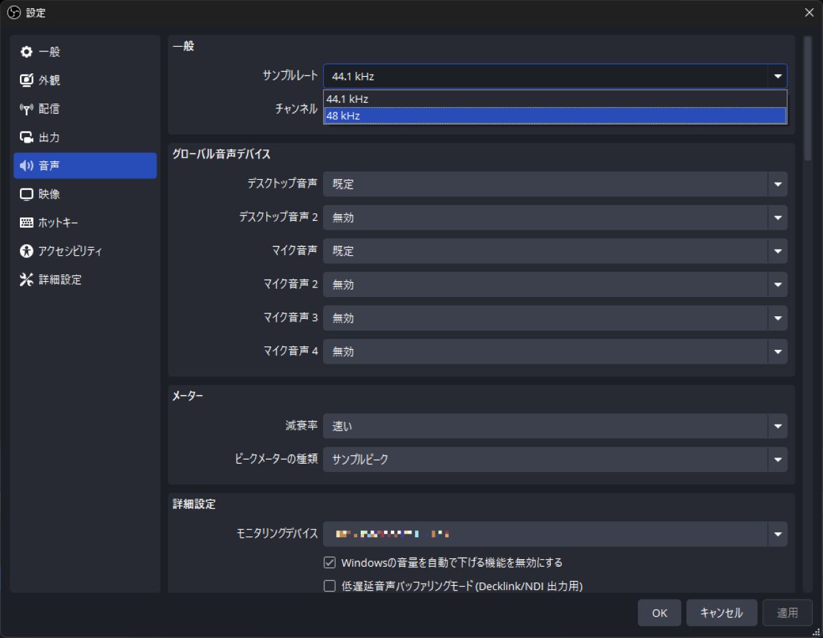 そして、この手の配信でありがちなトラブルは音ズレだ。OBSを立ち上げて配信を行うと、基本的には音がズレてしまう。それを解消するにはOBSの「設定」ウインドウを開き「音声」を押してサンプリングレートを「48kHz」に変更。OS側の設定画面から「システム」→「サウンド」を経由して、「スピーカーのプロパティ」から詳細設定をし、形式を「24bit/48kHz」にしてみよう。まだ解消しない場合はOBSの「オーディオの詳細プロパティ」からミリ/秒単位で調整を試みることができる。