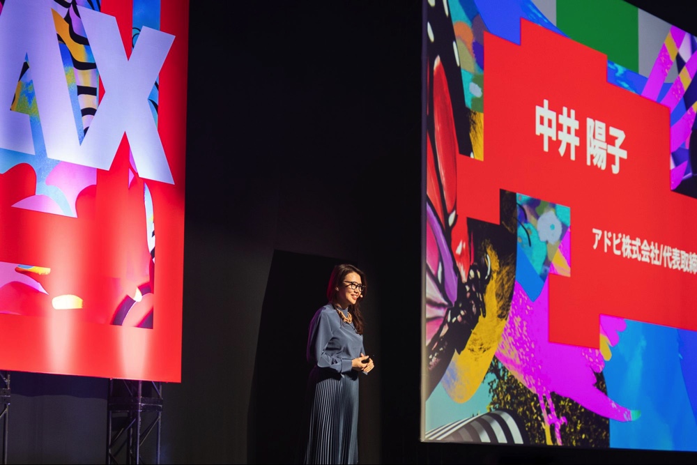 始めに登壇したのはアドビ株式会社 代表取締役社長の中井陽子氏。中井氏によれば今年の『Adobe MAX Japan』は非常に盛況で、来場チケットが一ヶ月前に売り切れたという。そんな日本のユーザーの熱い思いに応え、可能性と未来について話してもらうとしてシャンタヌ・ナラヤン氏の登壇を告げた。ナラヤン氏の登壇も『Adobe MAX Japan』では初めてのことだ。
