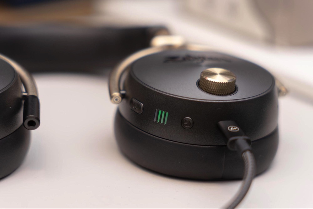 右耳側のハウジング部分にある電源ボタンをオン・オフすると、起動/終了音としてシンバルの音が鳴る。こういうところで細かなキャラ付けがされているのはうれしい。本体の側圧も相まってか、ノイズキャンセリングは強力に作用する。ノイズキャンセリングの度合いは2段階あり、「Half」と「Full」を切り替えられる仕組みだ。