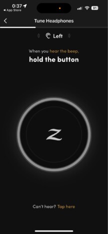 専用のアプリがあるのも本製品の特長だ。アプリにはサウンドテストの機能があり、これによってユーザーの耳の特性を測り最適な音質で音楽を再生できる。実際に試してみると耳鼻科の聴力検査で耳にするような各帯域のテスト音が流れ、自身の耳に最適化されたイコライジングが施された。この設定はヘッドホン本体に保存されるので、スマートフォン以外の音源を再生する際にも適用できる。設定はいつでもオン・オフできるので、好みに応じて使うとよい。