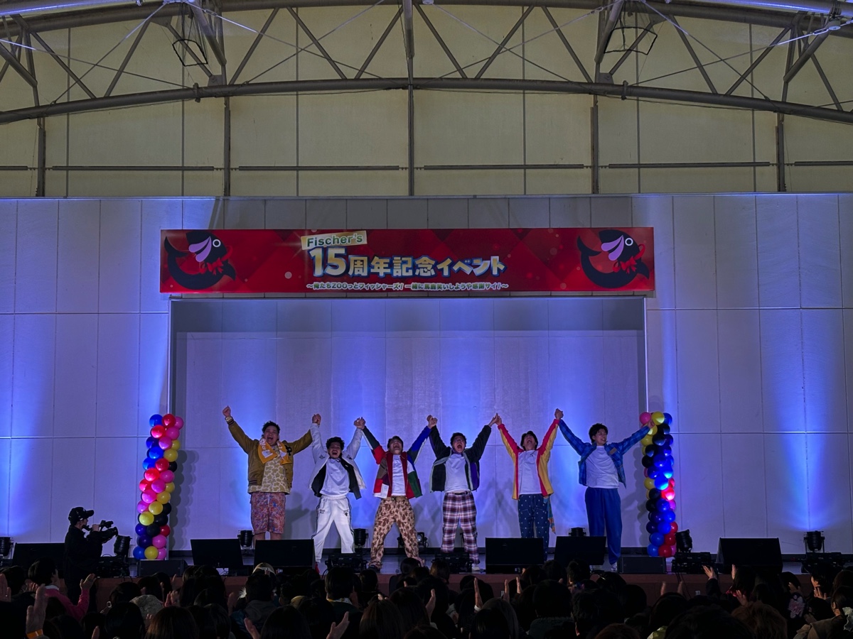 寒空の下行われていたイベントは、早くも終わりの時間に。今回のイベントを振り返り、モトキが「今日1日、一緒に楽しめてよかったです。また遊びに来てねー」と挨拶すると、ダーマは「久しぶりのイベントで誕生日も祝ってもらって、本当にありがとうございました」と、ふたたびファンに感謝。マサイの「みんな、今日は来てくれてありがとう!」とのお礼に続き、ンダホは「こうやって直接みなさんの目をみれて、一緒に楽しむことができて、15周年最高のスタートが切れそうです。僕たちと一緒に15周年イヤー、楽しんでいきましょう」と、記念イヤーのへの思いを口にすると、ザカオは「久しぶりのイベント、みんなと会えて本当に嬉しかったです!」と挨拶。