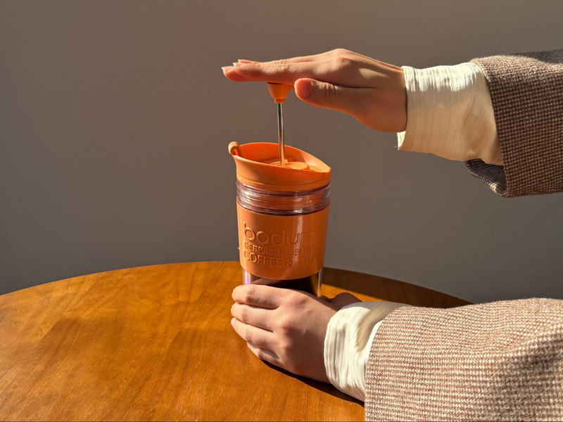 フレンチプレスの第一人者的メーカー「BODUM」の「TRVEL PRESS SET」は、二重構造のプラスチック製タンブラーと、金属フィルター付きのロッドが組み込まれたフタがセットになった商品。