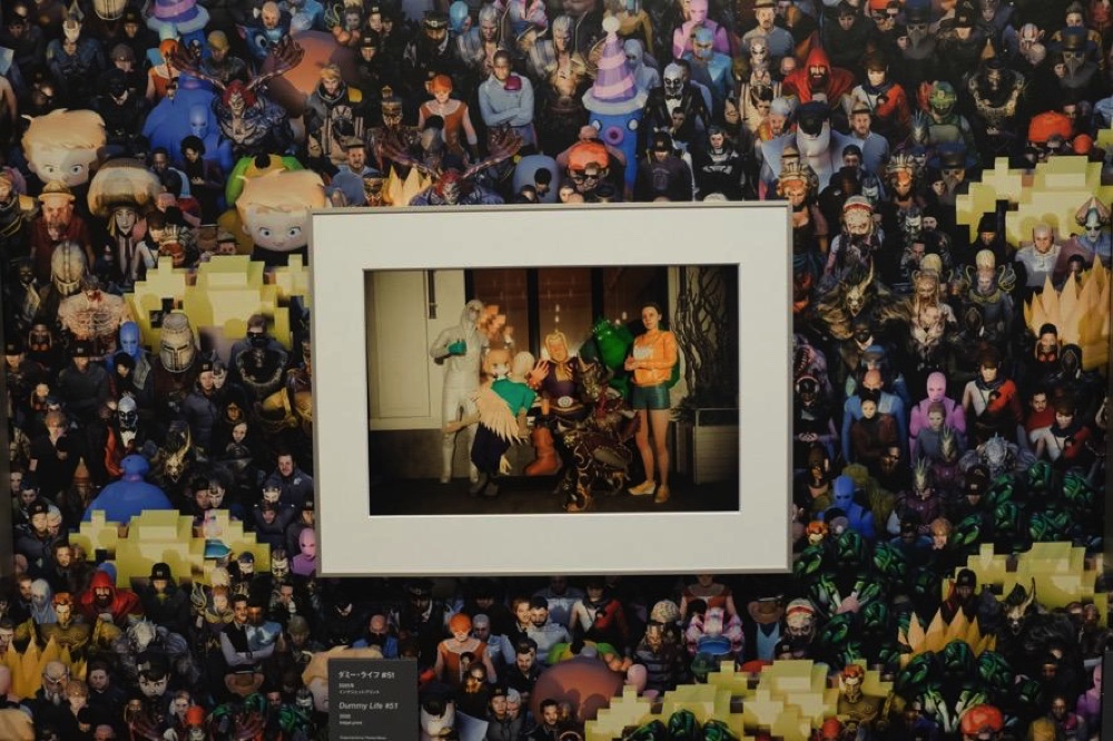 また同時に展示されている《ダミーライフ》シリーズは、生き生きと過ごすアセットたちの姿を、写真に捉えたかのような静止画作品。一見オンラインゲームのスクリーンショットのようにも見えるが、工夫されたライティングや構図によって現実の写真にも見え、不思議な印象を受ける。この作品は写真に映る人物をアセットに置き換えて制作されており、現実空間と仮想空間を越境したことで生まれた独特なバランス感を楽しめる。