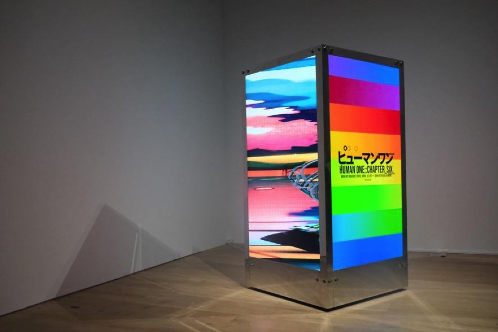 《ヒューマン・ワン》は、4面が16Kの高解像度ディスプレイで構成された2m20cmの箱形の作品。筐体が回転し、その中をメタバースで生まれた最初の人間が歩き続ける、“ビデオ彫刻”作品だ。