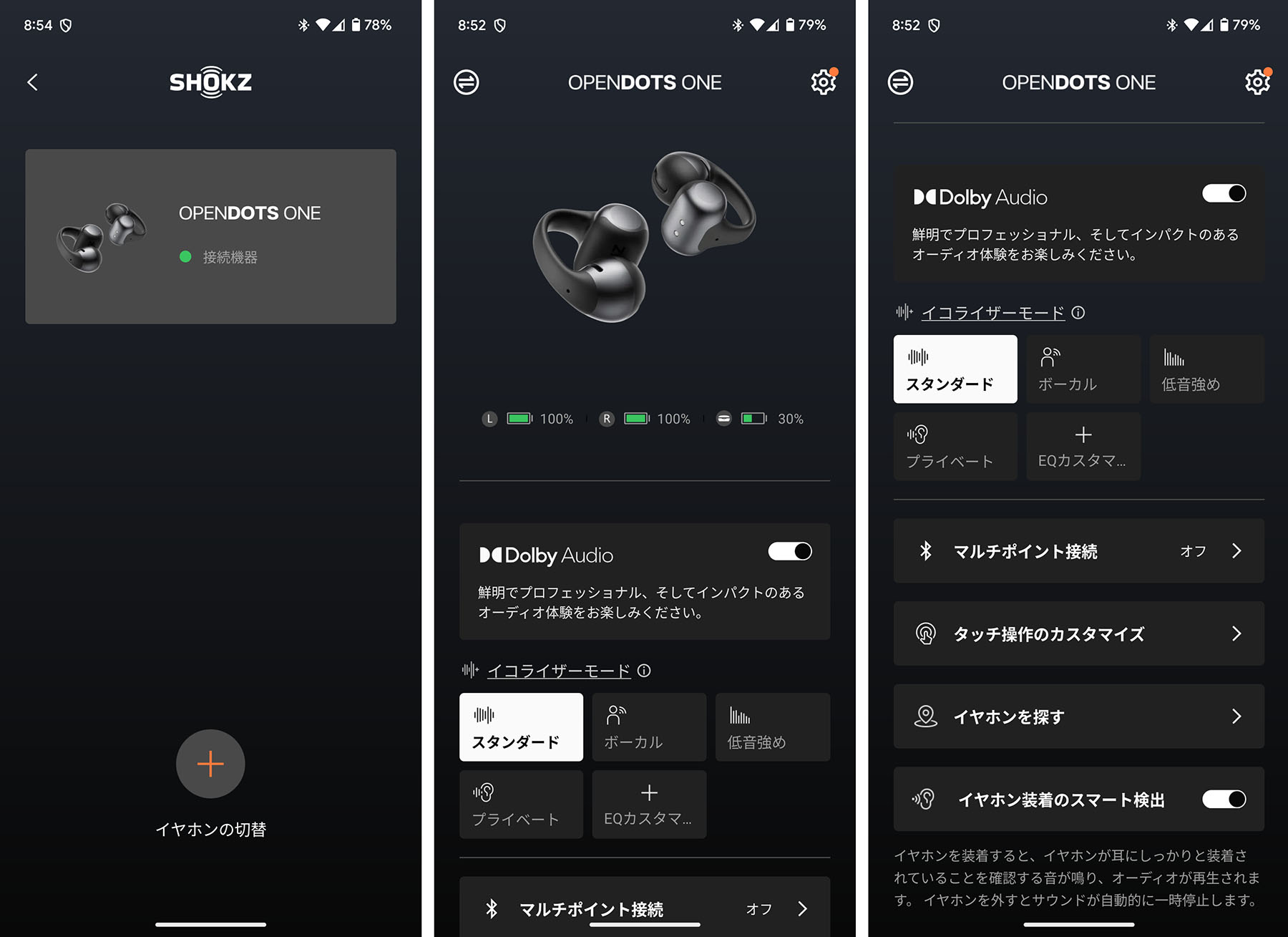 またShokzとして初めて「Dolby Audio」にも対応し、没入サウンドも楽しめるようになった。再生機からステレオで入力された信号を『OPENDOTS ONE』内部で処理して、コンサート会場のような臨場感で再現してくれる。この機能は初期状態ではオフになっているので、「Dolby Audio」を楽しみたい場合はアプリでオンにする必要がある。