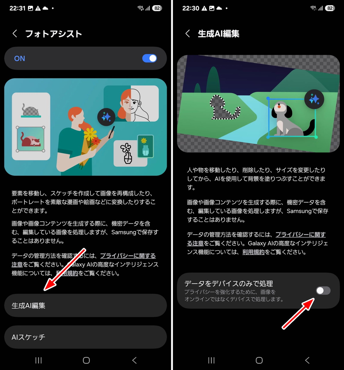 これは撮影した写真に対して、特定のコンテンツを削除するなどの生成AIに関する機能だ。生成AI編集の利用にはネットワーク接続が必須だが、「データをデバイスのみで処理」にチェックを入れると、ローカル環境での処理に切り替わる。