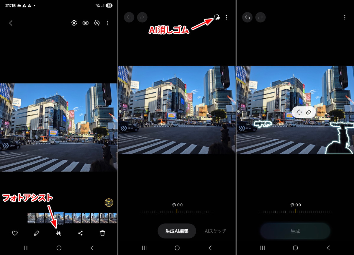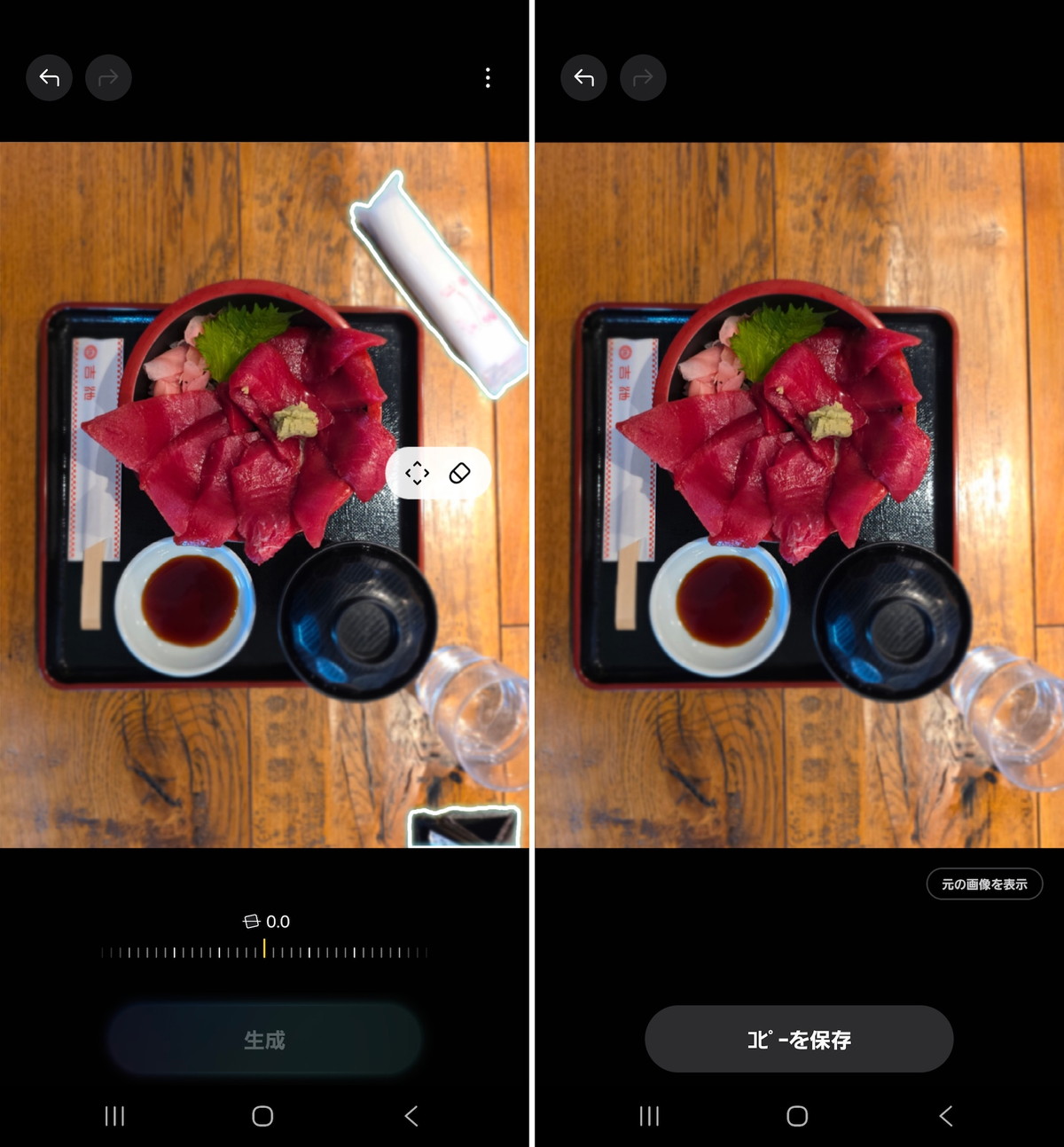 タップすると生成AI編集とAIスケッチが利用可能となるが、ここでは生成AI編集を使っていく。画面右上のAI消しゴムのアイコンをタップするだけで、AIが写真を解析し、不要と思われるオブジェクトを自動的に選択してくれる。あとは「生成」をタップして、オブジェクトを消去するだけだ。