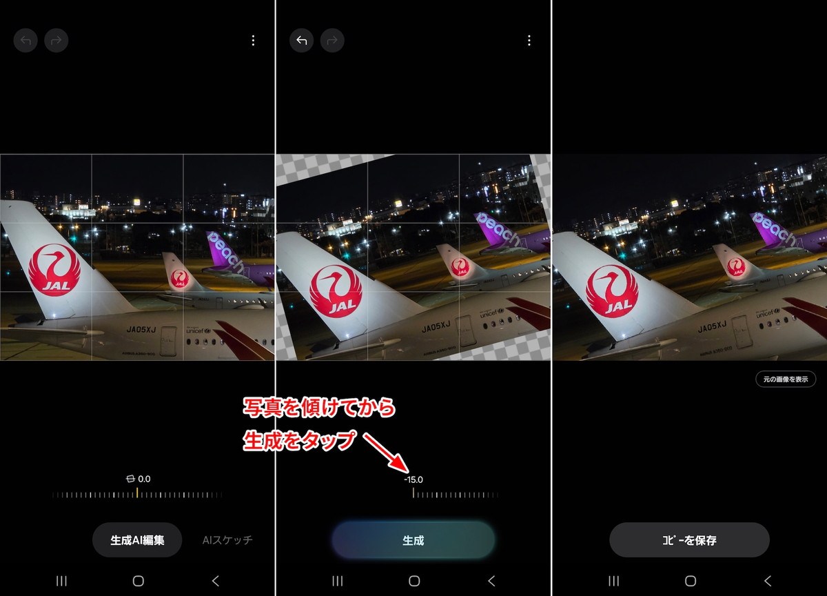 また、生成AIは背景も生み出してくれる。「この写真、傾けたほうがカッコいいかも」と思ったら、編集時に角度を付けてみよう。足りない部分をAIが自動的に補ってくれるため、元写真を小さくトリミングすることなく傾けることが可能だ。